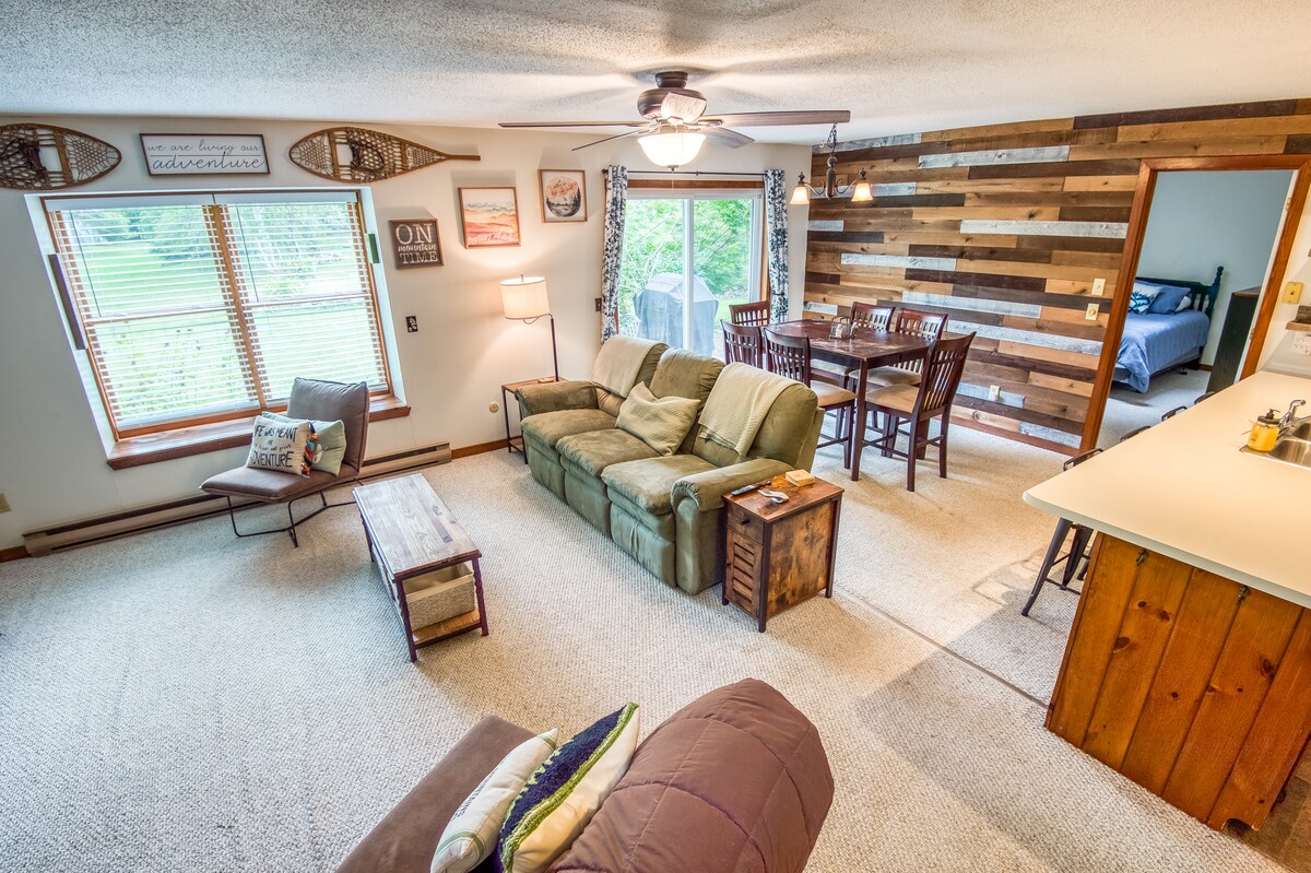 Este condominio de dos pisos con una ubicación ideal está en la montaña entre Barker y White Cap Lodges. Puedes esquiar dentro/fuera usando el sendero Roadrunner, que está justo al otro lado del estacionamiento. Hay mucho estacionamiento y el condominio se encuentra en el Edificio 2, que está más cerca de la zona común de la cabaña con chimenea y acceso a la piscina/jacuzzi/sauna. Si bien técnicamente se trata de un dormitorio, hay una pared entre la habitación queen y la habitación doble para mayor privacidad, y una cama tamaño queen en la sala de estar.