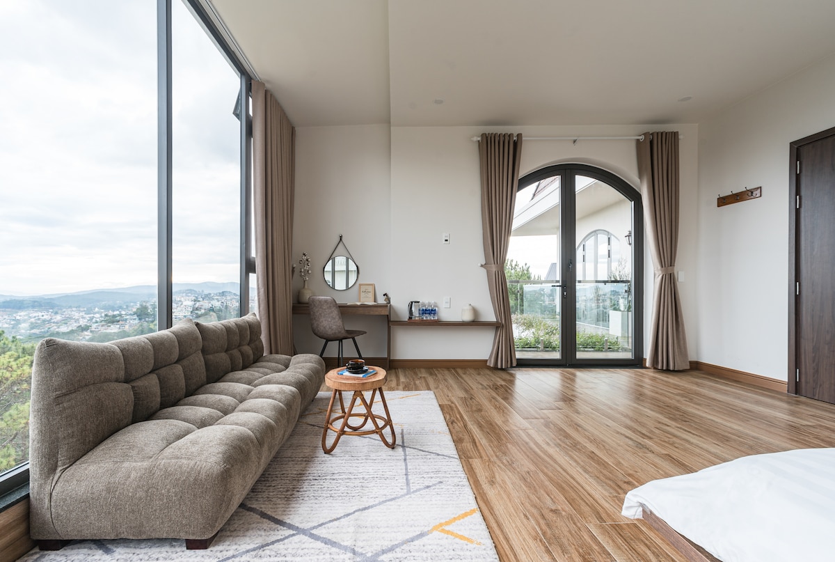🌲 ¡Te damos la bienvenida a Penthouse Retreat, Stardome Dalat! Ubicado en el piso más alto de la propiedad, el apartamento ofrece privacidad absoluta, instalaciones completas y vistas poéticas al bosque de pinos. ✨ • Relajante bañera de vidrio mirando el bosque desde el baño • Cocina bastante privada, acogedora mesa de comedor de madera • Televisión grande, cuenta de Netflix, wifi fuerte Estacionamiento gratuito • Tamaño: 70 m² (apto para 2–4 personas) 👉 Nota: Dado que el Penthouse está en el ático, tomará el ascensor hasta el cuarto piso y tendrá que subir las escaleras 1 piso.