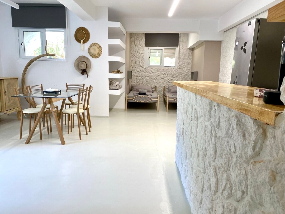 Villa Lemon has a living/dining room, kitchen, 2 sleeping rooms, 2 bath rooms, a large lounge/dining terrace, a small terrace where you can sit in the shadow in the afternoon and a balcony with sea view. It is fully furnished and has a modern design where natural materials such as stone and wood are mostly used giving the interior a warm, intimate feel. The villa is 70 square meters and can accommodate up to six people in one double bed, two single beds and on the sofa bed in the living room.