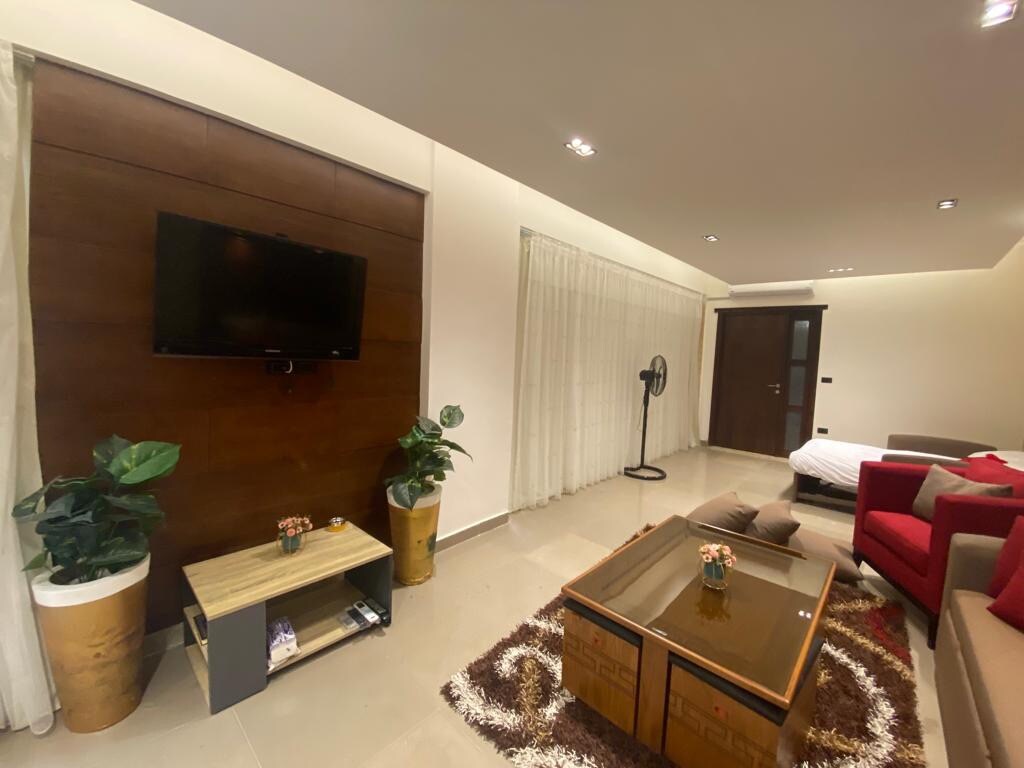 Disfruta de un espacioso estudio en el Nuevo Cairo con una acogedora cama tamaño queen, un sofá cama y un jardín privado con asientos al aire libre. El estudio cuenta con una cocina totalmente equipada con estufa, horno, microondas, nevera, lavadora, dispensador de agua y hervidor de agua. También encontrarás un baño moderno, conexión Wi-Fi rápida, TV y aire acondicionado para una estancia cómoda. Situado en un barrio tranquilo y seguro, cerca de tiendas y cafés. Nota: No se permiten estancias mixtas (a menos que estén casadas), alcohol/drogas, ni visitantes ni eventos.