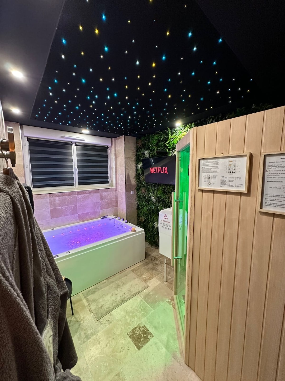 Alojamiento de alta gama con balneario, sauna, sofá tántrico, puerta secreta que revela un spa privado con sauna y mesa de masaje. Disfrute de un paréntesis de relajación en este magnífico alojamiento inspirado en Bali de 66 m² para dos personas. Todo confort: • Suite con cama King Size (180x200), ropa de cama de alta gama • Bañera doble con cielo estrellado • Habitación secreta con mesa de masaje y sauna • Sala de estar con chimenea de vapor y televisión conectada • Cuarto de baño con ducha doble • Sillón tantra