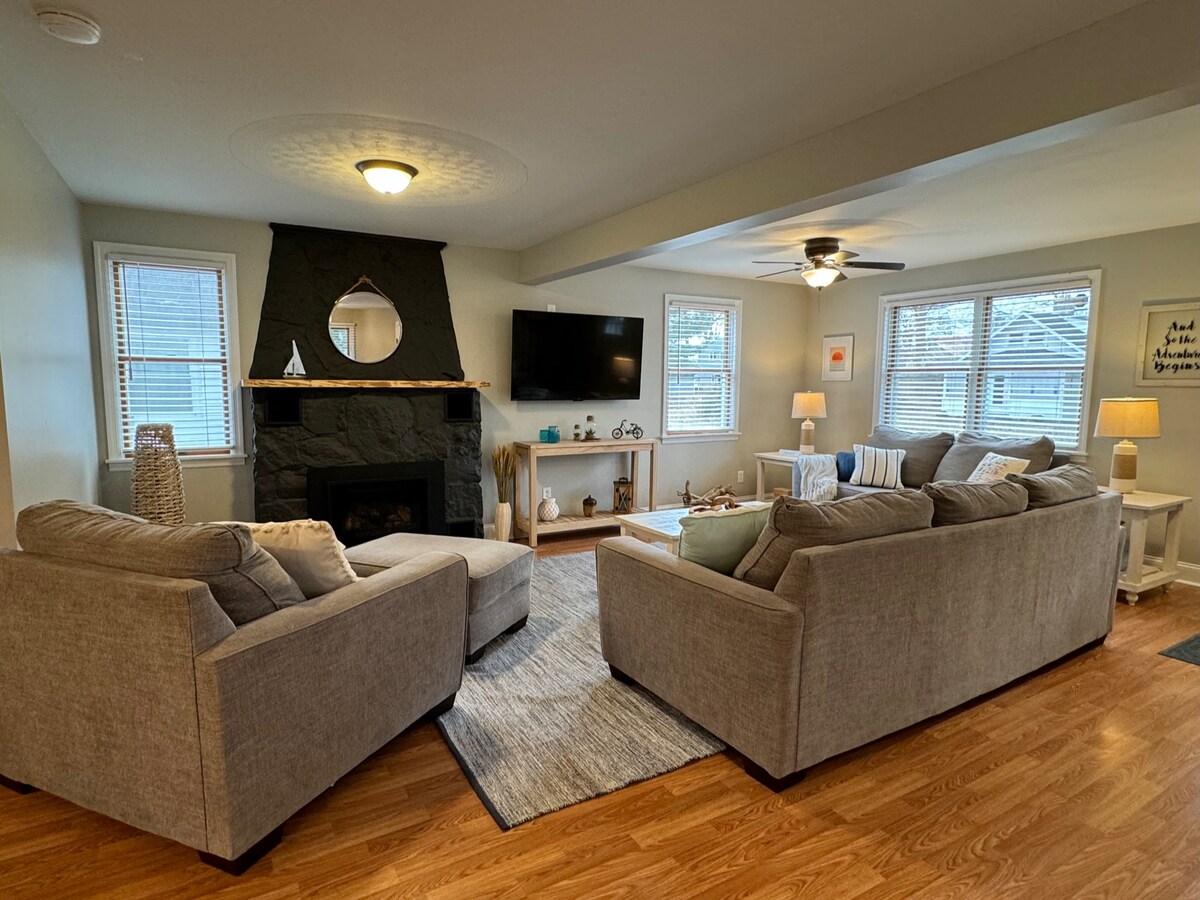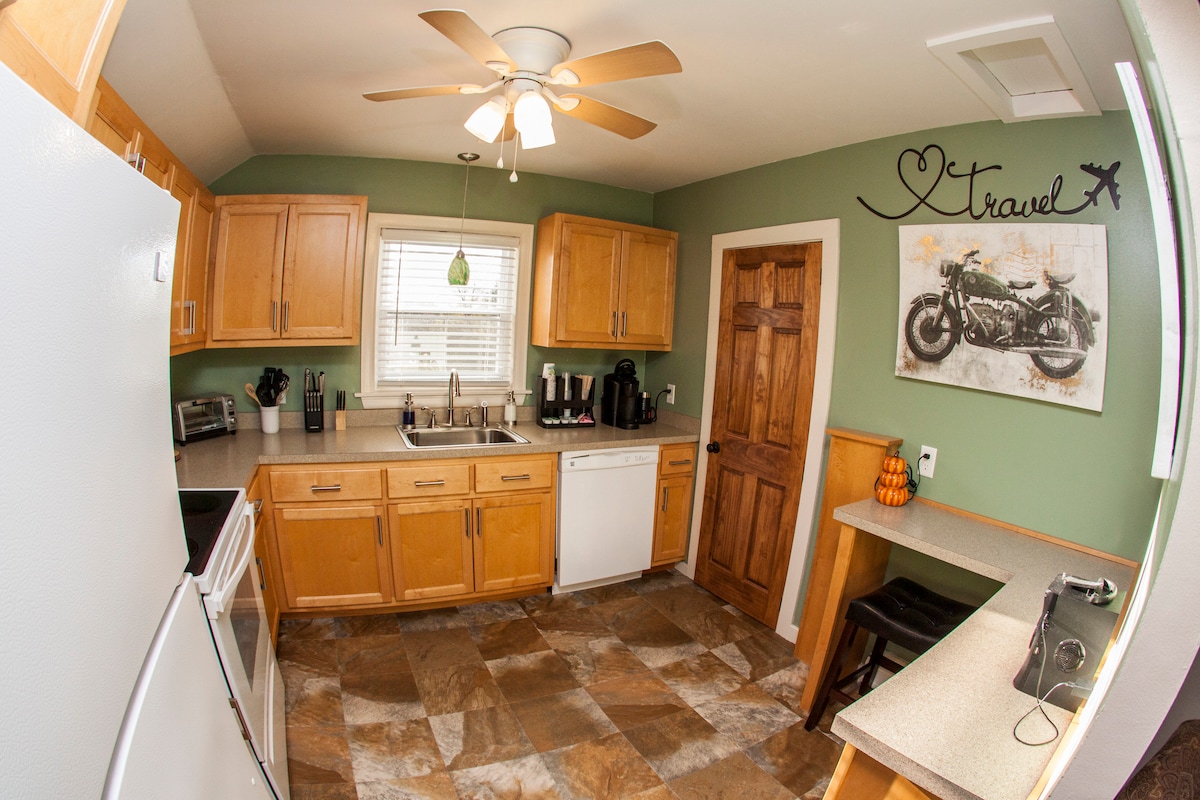 Lleva a toda la familia a este fantástico alojamiento que tiene un montón de espacio para divertirse. Este rancho de 2 dormitorios y 1 baño y medio tiene una distribución abierta con la cocina, el comedor y la sala de estar, todos abiertos entre sí. El dormitorio principal es enorme, con una cama tamaño king recién instalada, un escritorio y una silla cómoda. El baño principal tiene una ducha con asiento, sin bañera. También se puede acceder al baño principal desde el pasillo. El segundo dormitorio tiene 2 camas individuales. El sofá de la sala de estar también tiene una cama extraíble.