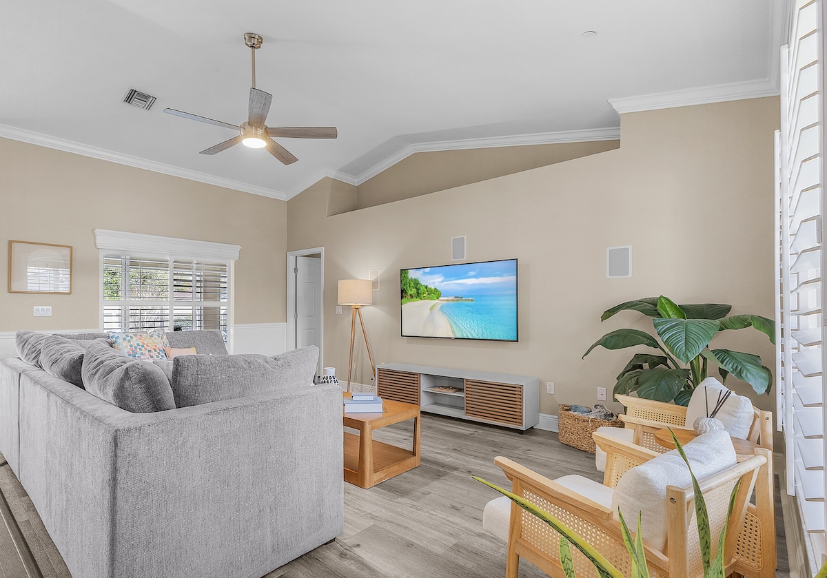 Esta espaciosa casa tiene capacidad para 8 personas con 1 cama tamaño king, 1 cama tamaño queen, 2 camas individuales y un sofá cama, perfecto para familias o grupos. Disfruta de tu piscina climatizada privada, parrilla, ping pong, futbolín y mesa de billar pequeña. Ubicado cerca de Fort Myers y hermosas playas, en un barrio seguro y tranquilo con fácil acceso a restaurantes, atracciones y diversión al aire libre. ¡La mezcla perfecta de comodidad y entretenimiento para tu próxima escapada a Florida!