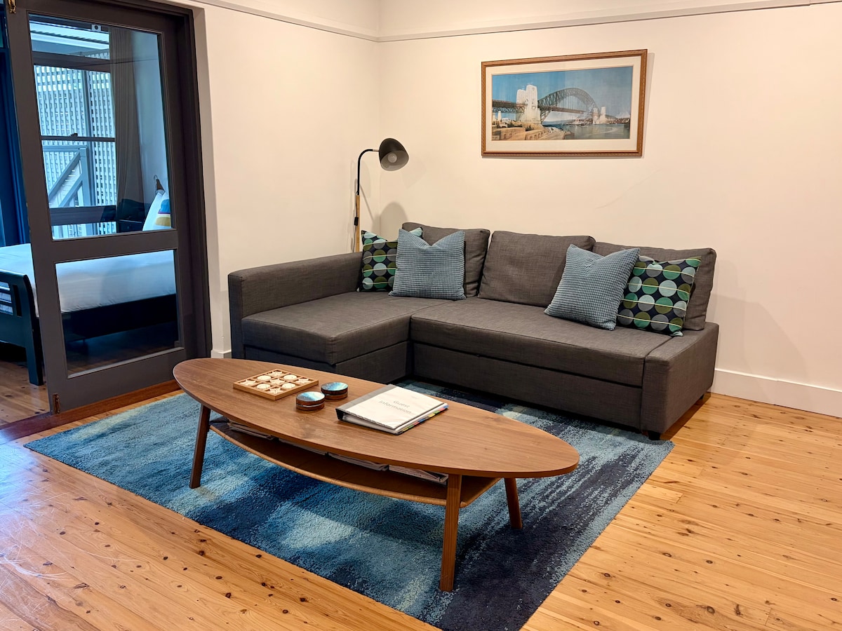 Siéntate en la terraza bañada por el sol de esta acogedora casa de época y disfruta de las vistas panorámicas de Green Park. Todas las habitaciones son espaciosas y cuentan con todo lo esencial para que te sientas como en casa. Como anfitriones con una familia joven, ocupamos parte de la propiedad y compartimos una pared común con la casa de huéspedes. Sin embargo, el AirBnB es privado, tiene entrada independiente y no comparte zonas comunes. Esta casa de huéspedes independiente forma parte de una elegante casa familiar de la federación en una manzana esquinera con su propia entrada privada. Tiene un dormitorio con armario empotrado y escritorio. La sala de estar es una sala de estar/comedor y cocina americana combinadas que conducen a una gran terraza exterior. El espacio es flexible y perfecto para viajeros de negocios, familias jóvenes y parejas que buscan disfrutar de las mejores partes de Sídney. Tenemos un colchón inflable y una cuna, que incluiremos o retiraremos en función de tus necesidades para dormir. ¡Te sentirás como en casa lejos de casa! Los huéspedes tienen un acceso privado separado sin zonas compartidas y acceso directo a Green Park desde la terraza exterior accesible a través de una entrada lateral. Esta propiedad admite el acceso sin llave con tecnología de August Home. Si lo deseas, no hay necesidad de interactuar con los residentes de la casa, el apartamento es tu espacio y es totalmente privado. Al otro lado de la carretera de la casa se encuentra Greens Park, que cuenta con un parque infantil, canchas de tenis públicas y aros de baloncesto. El campo de golf Cammeray también está prácticamente en la puerta, y hay una gran variedad de cafeterías, restaurantes y panaderías cerca. Cammeray es una excelente ubicación con acceso inmediato en todas las direcciones en coche. Hay mucho aparcamiento durante todo el día en la calle justo fuera de nuestro alojamiento. El transporte público es muy fácil en la ciudad, North Sydney y Mosman. Incluso está a poca distancia a pie de North Sydney, Neutral Bay y Crows Nest para trabajar o jugar. La cocina americana está equipada con nevera bar, microondas/horno, 2 placas de inducción, tostadora, jarra y artículos de primera necesidad.