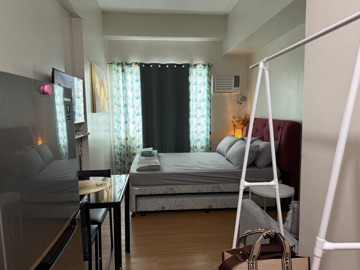 AVIDA TOWERS ASPIRA (Torre 1) - Apartamento tipo estudio en alquiler Ubicado en el corazón de la ciudad de Cagayán de Oro, a pocos minutos de SM Downtown, Centrio Ayala Mall, Gaisano Mall, restaurantes y escuelas. El apartamento del Sr. JoRCH cuenta con una cama de matrimonio con una cama individual extraíble, un televisor inteligente de 42 pulgadas con wifi y Netflix, una cocina de inducción, un horno microondas, una arrocera, una nevera y utensilios de cocina esenciales. El baño está equipado con bidé y calentador de agua para mayor comodidad.