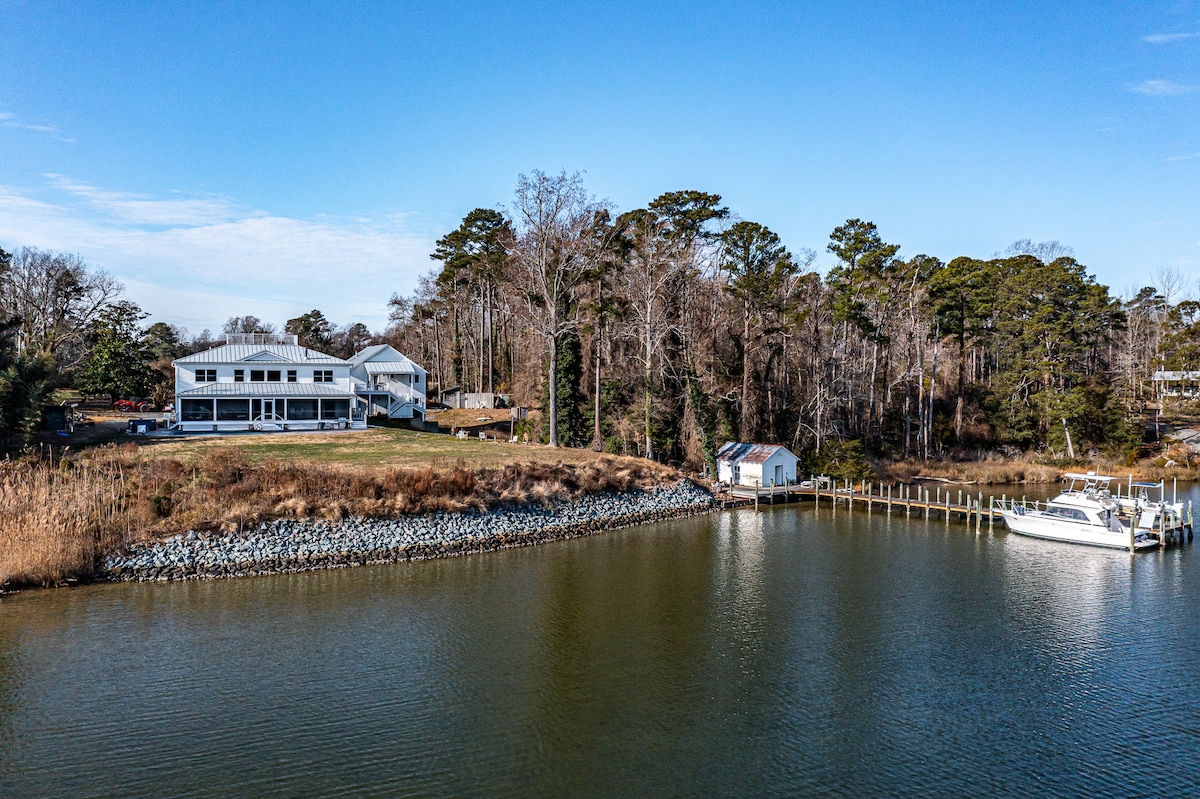 Blue Heaven on the Cove es una relajante escapada frente al mar ubicada en un afluente que desemboca en la bahía de Chesapeake en Reedville, VA. Ven a disfrutar de la vida de la bahía en nuestra casa frente al mar con un muelle sin escalones y aprovecha tus actividades acuáticas favoritas: kayak, pesca, pesca de cangrejos, surf de remo, etc. Nuestra casa de 3 dormitorios y 2 baños tiene capacidad para 10 personas. Porche con mosquitera, equipo de actividades acuáticas incluido, sala de juegos con mesa de tejo de 12', 5 RokuTV, chimenea al aire libre. ¡Cargador de coche eléctrico de 50 amperios! Profundidad del agua 3' MLW con amarre para barcos.