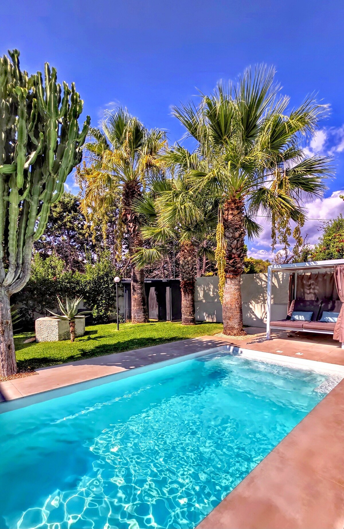 Una residencia de diseño con piscina climatizada a 28–30 °C, rodeada de vegetación y a solo 4 minutos a pie de la playa. Un refugio privado para aquellos que buscan elegancia y tranquilidad, cerca de Ortigia y Noto. La piscina, accesible durante todo el año, es un spa privado al aire libre ubicado en la naturaleza. La terraza con vista al mar, la chimenea y la chimenea interior crean un ambiente cálido y sofisticado. Diseñado por el arquitecto C. Calvagna, Shati combina materiales refinados y arquitectura de autor para una experiencia de cinco estrellas.