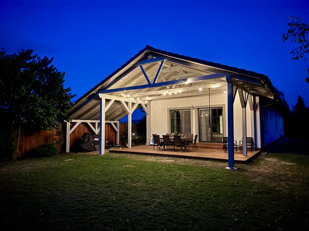 Construido con nuestras propias manos desde los cimientos hasta los muebles interiores hechos a mano. Alrededores de la casa arreglados para su comodidad: terraza con tumbonas y bañeras para bañarse en verano, bañera con agua caliente para los días de primavera y otoño, asientos al aire libre en una terraza parcialmente cubierta junto a un pequeño estanque, espacio para hacer barbacoas o asar. Y vegetación plantada por todas partes. Quería que los huéspedes experimentaran la calidad y la comodidad a primera vista y en su propia piel.