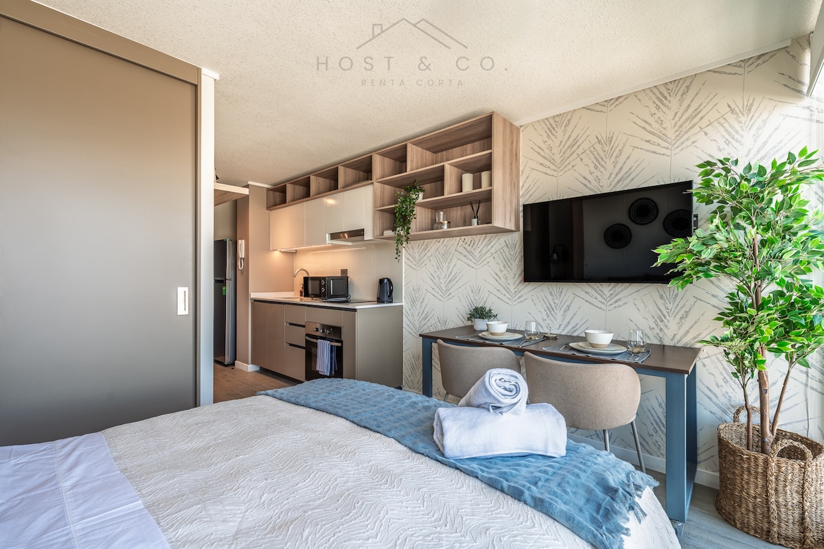 Disfruta de nuestro moderno alojamiento, tranquilo y céntrico con orientación norte, muy bien conectado a un paso de estación de metro Ñuñoa, supermercado , bancos y comercio en general, cercano a la bohemia de plaza Ñuñoa, Estadio Nacional y restaurantes con toda la onda del barrio. Si te gusta la cocina este es tu lugar, hemos pensado en una cocina integrada a los espacios con equipamiento cómodo y moderno. Incluye estacionamiento subterráneo en el edificio.