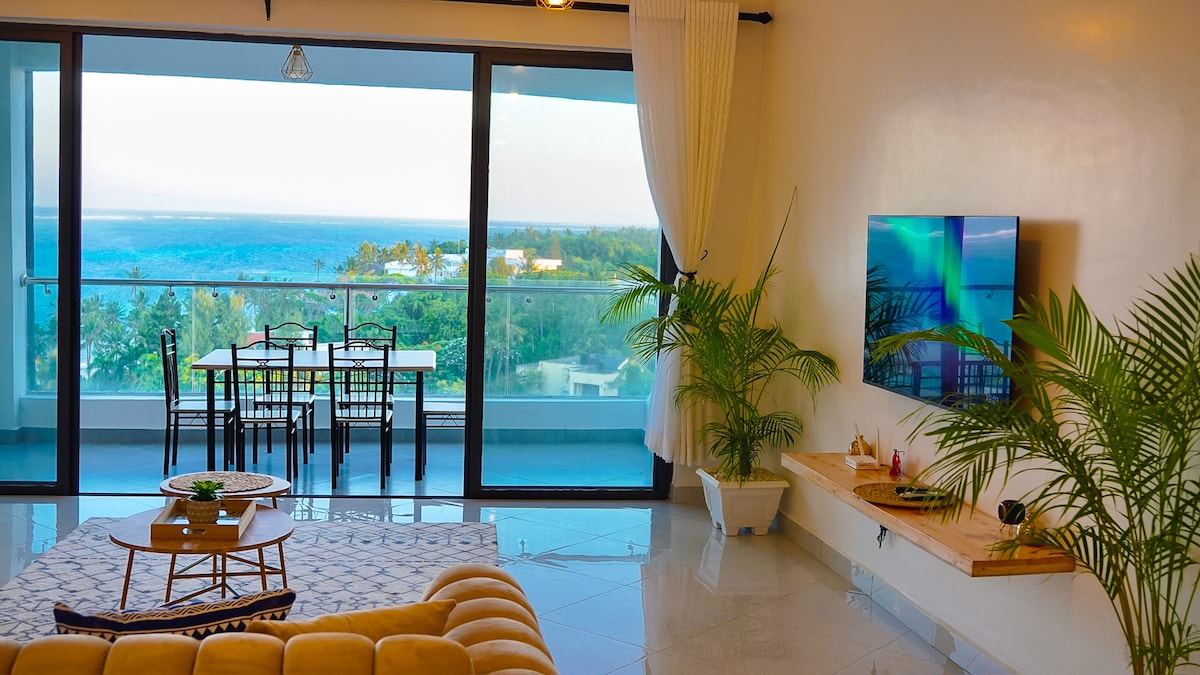 Departamento moderno de lujo en Nyali ✔ Wifi rápido, piscina y cocina totalmente equipada ✔ Ideal para parejas, viajes de negocios y estancias prolongadas El espacio ofrece una sala de estar moderna con un televisor inteligente de gran tamaño y Netflix, aire acondicionado en todas las habitaciones y un dormitorio acogedor con ropa de cama de primera calidad. Tanto si viene por trabajo como para relajarse, todo está preparado para que disfrute de una estancia perfecta. 🌴 Lo que te encantará: • Sala de estar luminosa y espaciosa. • Cómoda cama tamaño queen • Wifi rápido y fiable. • Balcón privado con vista al mar • Acceso a la piscina. • Aire acondicionado