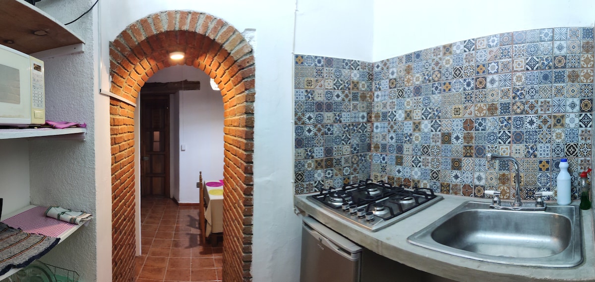 Disfruta de este alojamiento tranquilo, fresco y céntrico, a solo 10 minutos del zócalo de la ciudad caminando. Servicios: Una habitación con cama matrimonial Smart TV, baño completo, cocineta con cafetera y licuadora. Sala con TV por cable, WIFI, cochera para 1 auto, contamos con servicio de agua caliente, gas, utensilios de cocina. Entrada directa a la calle principal, transporte público en la puerta, a una cuadra una tienda de autoservicio.