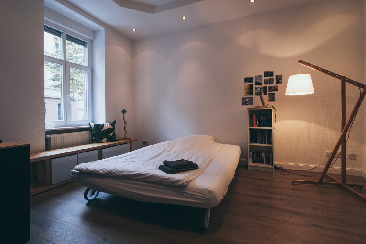 Don't want to stay in over-priced anonymous hotel rooms in Frankfurt? Come to the trendy and vibrating Offenbach - the cooler Frankfurt. :-) Stay at our shared co-working place, where we usually spend our time painting, developing pictures and creating. Less than 30 minutes commute to the Frankfurt fair, airport or main station door-to-door and only three minutes by foot to Wilhelmsplatz - one of the best places in Hessen for bars and restaurants by night and organic farmer's market by day.