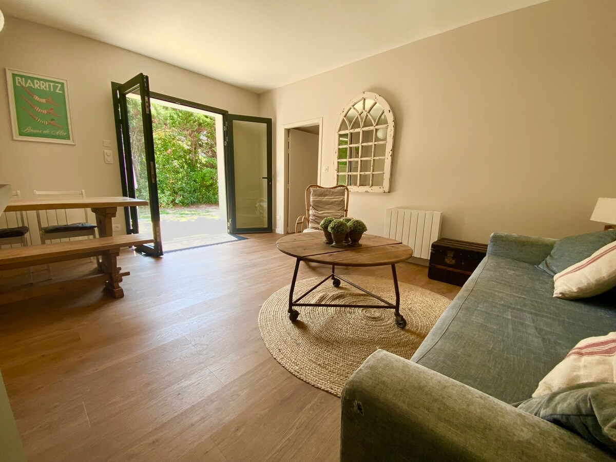 Casa con jardín tranquilo del pinar, directamente en el campo de golf y a 2 pasos de la playa (playa a pie en 10 minutos) con estacionamiento privado compuesto por: - un salón con cocina abierta equipada, - un jardín privado - una habitación independiente con una cama para 2 personas - un altillo abuhardillado con 2 camas de una persona - un baño con ducha - un inodoro independiente Playa a pie Línea de autobús cercana que comunica con Bayona, Biarritz, San Juan de Luz, Aeropuerto a 15 minutos en automóvil,