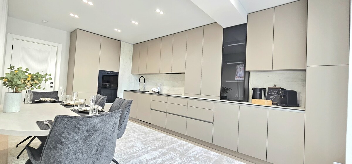 Entra en 110 m² de lujo en este nuevo edificio en Avram Iancu 32. Dos dormitorios tamaño king (200 × 200 cm), dos baños (bañera y lavabos dobles, ducha a ras de suelo) y una enorme sala de estar/comedor con sofá cama. Disfruta de una cocina de calidad de chef, estación de café/té, espacios amplios y ropa de cama de primera calidad. Tranquilo pero céntrico, con acceso al ascensor, estacionamiento gratuito en la calle, llegada autónoma y Wi-Fi rápido. Perfecto para familias, parejas o viajeros de negocios que buscan espacio, estilo, comodidad y elegancia.