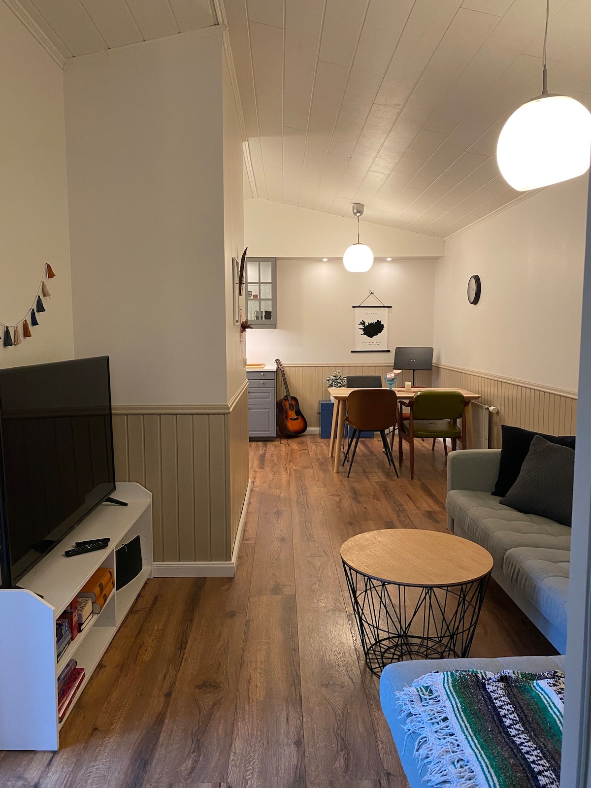 The cottage is in the oldest part of Hafnarfjörður, a small harbor town. There are great farm-to-table restaurants, bakeries, live music, artist studios and swimming pools nearby. It’s conveniently located across the road from the town’s bus terminal.