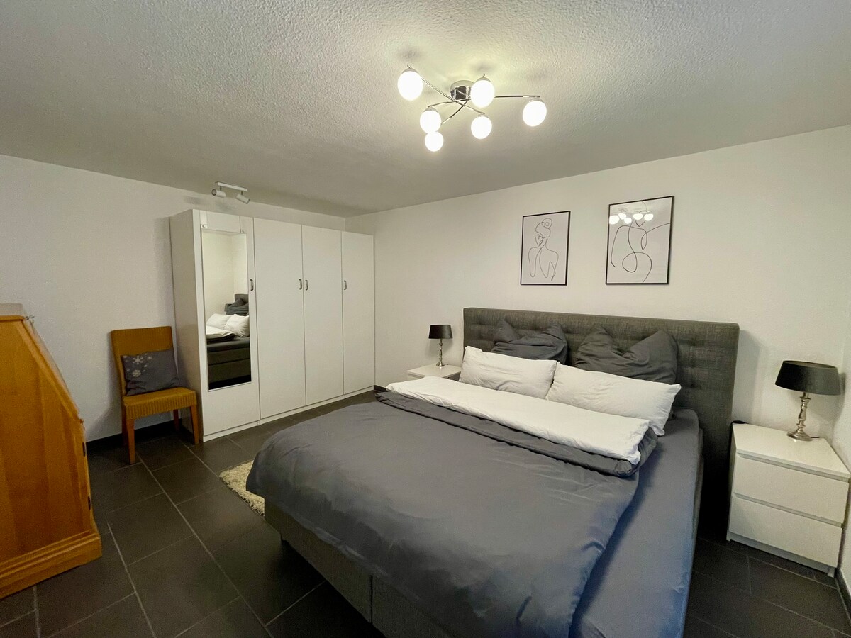 Luminoso y tranquilo apartamento en sótano para personas que trabajan fuera o amantes de la naturaleza con capacidad para hasta cuatro personas Información: - Persona de contacto en el lugar - Servicio de lavandería con cargo adicional - Servicio de compras por un cargo adicional - Posibilidad de dormir: cama (1,80 m x 2,00 m) y sofá cama con colchón (1,40 m x 2,00 m) - Lugar de trabajo en el dormitorio - Nevera sin congelador: almacenamiento de alimentos congelados en la casa contigua si es necesario