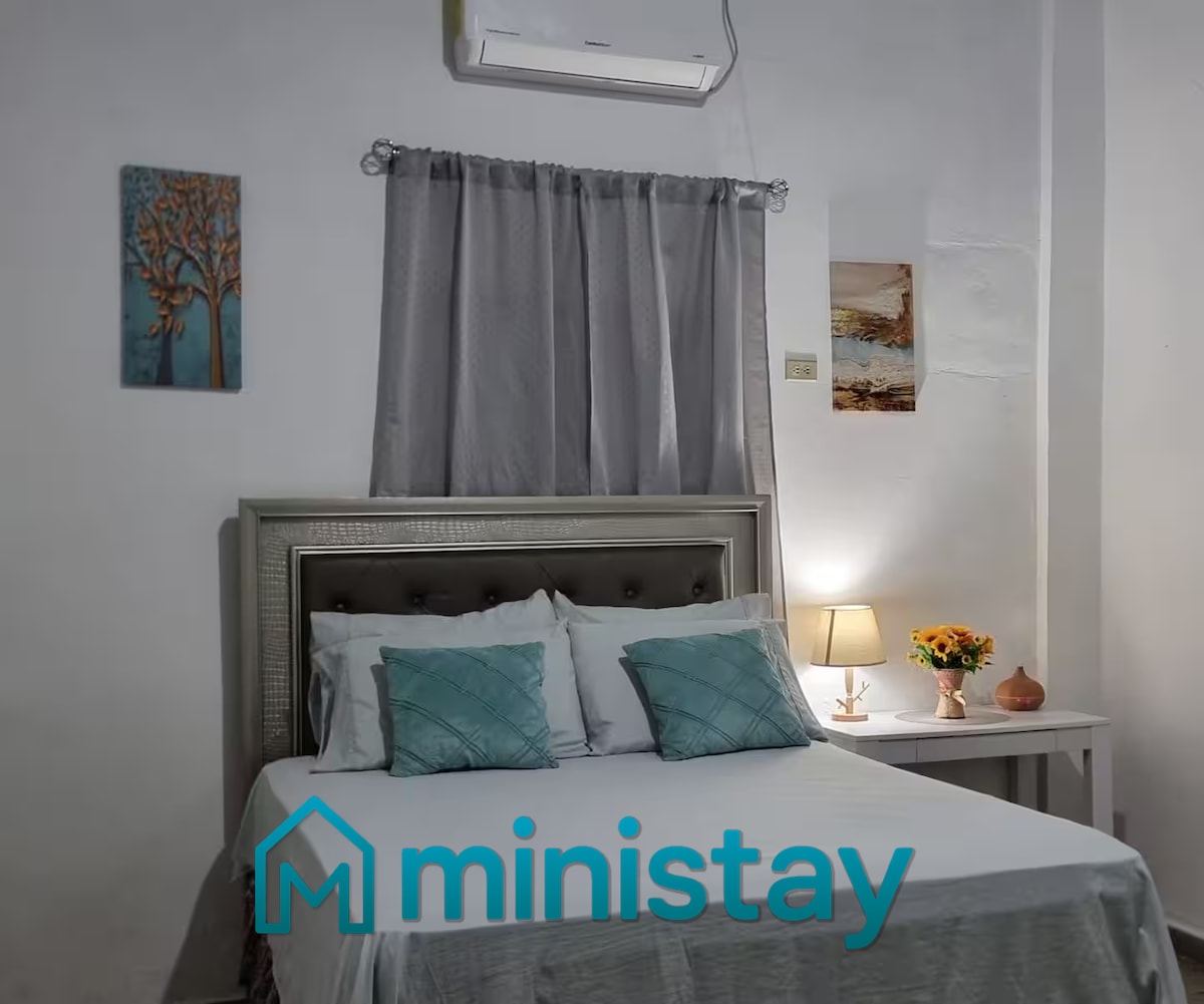 Hermoso apartamento céntrico, tranquilo y muy seguro, ubicado estratégicamente cerca de supermercados, restaurantes, bancos, tiendas, parques, clinicas, farmacias etc. •Espacio seguro y privado •Cocina completa con todo lo necesario para preparar tus alimentos •Sala acogedora •Sofá grande •Comedor para tres •Un baño completo •Un dormitorio cama Queen •Aire acondicionado •TV con cable •Lavaderia •Area de estacionamiento •Balcón privado •WiFi •Area social
