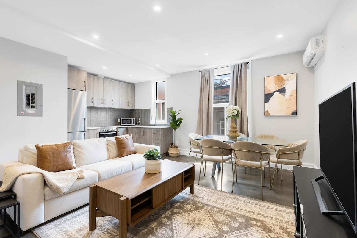 Elegante y totalmente renovado apartamento de 2 dormitorios y 1 baño en el corazón del vibrante Plateau Mont-Royal / Mile-End de Montreal. Este moderno alojamiento cuenta con aire acondicionado en todas las habitaciones, un sofá cama tamaño queen de alta calidad y todos los elementos básicos para una estadía cómoda. A solo 2 minutos de las calles Bernard y Saint-Viateur, hogar de lugares emblemáticos como St-Viateur Bagel, Cheskie 's y Café Olimpico, y a un minuto del transporte público al centro de la ciudad.