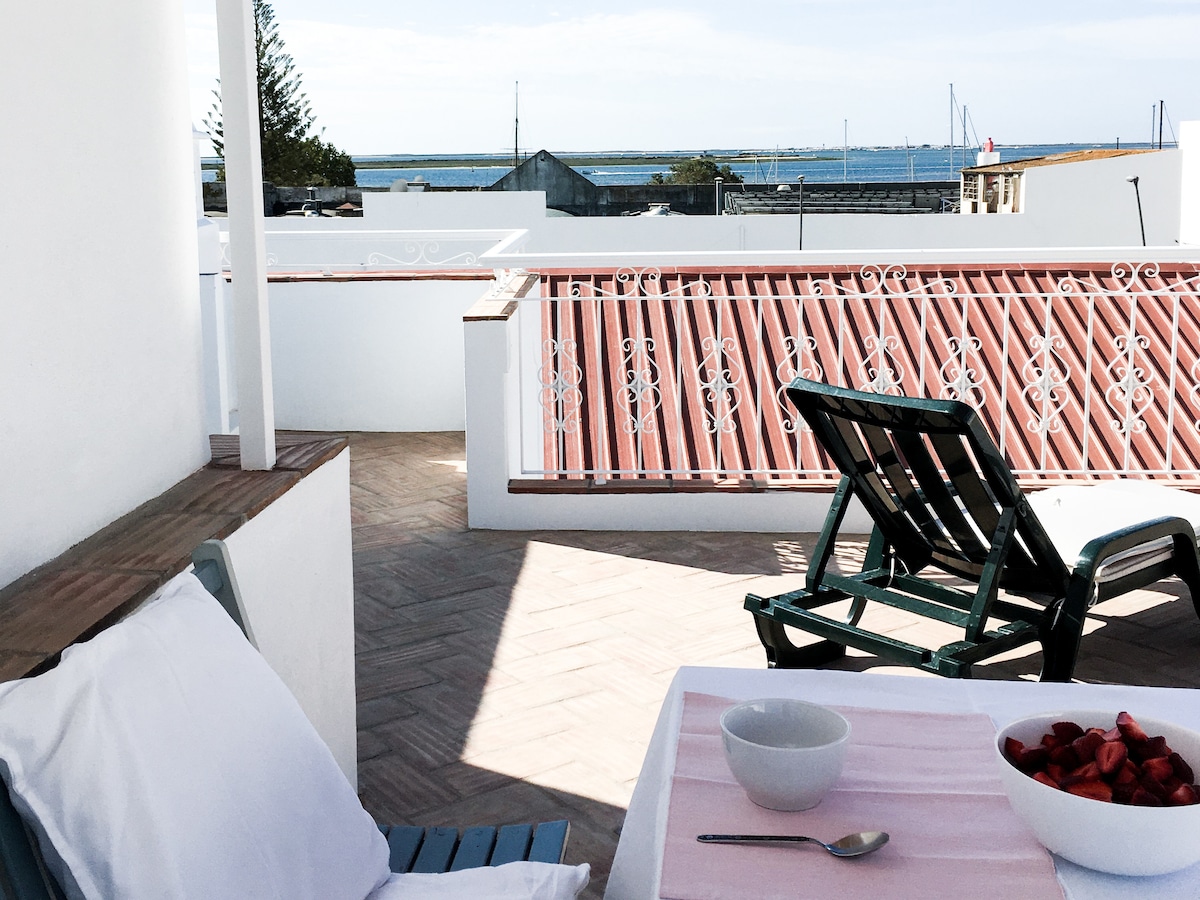Vive como un habitante más en nuestro apartamento de un dormitorio con terraza en la azotea y vistas al mar. En el corazón del casco antiguo, disfruta de nuestra fabulosa ubicación, a dos minutos del paseo marítimo, el mercado y todos los restaurantes. El apartamento está situado en el primer piso de una casa de pescadores tradicional e incluye un dormitorio, baño, cocina y pequeña sala de estar, con balcón y una gran terraza privada en la azotea. Cómodo durante todo el año. Olhão es encantador fuera de temporada. Totalmente renovado en 2021. Capacidad para dos personas.