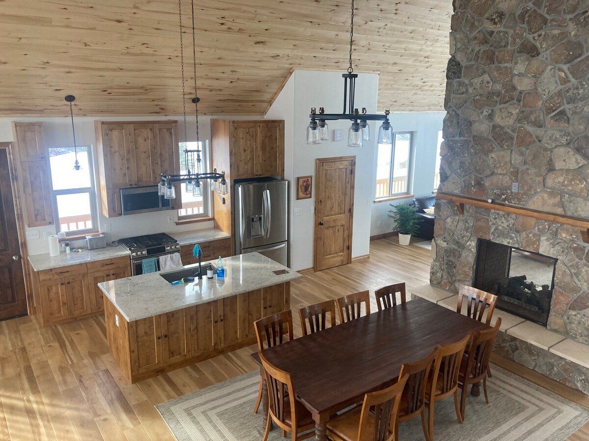 Ideal for family gatherings! Designed to accommodate multiple families (5 bedroom-bathroom suites plus a large loft). Year-round access, yet peaceful and remote. Located on a 5 acre lot with year-round stream and lots of space for outdoor activities. Ground-level trampoline. Large fire bowl. Large deck with table and gas fire pit. Parking for 8 vehicles. Lots of mountain roads and trails to explore. Four miles from Devil Creek Reservoir- great fishing and boating.