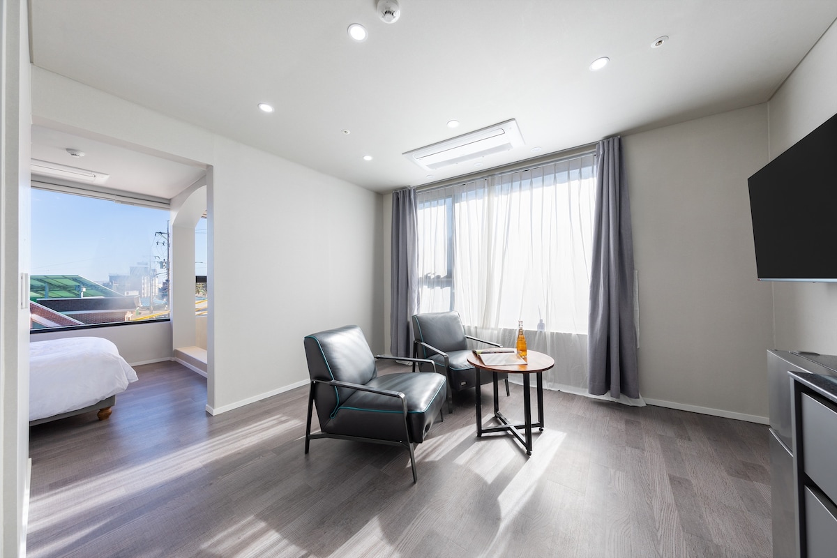 안녕하세요. 저희는 다양한 휴식 공간을 연구하고 제공하는 Onda입니다. 이 곳에서 머무르실 모든 분들께서 편안하고 행복한 시간을 보내시길 바랍니다. [숙소 소개] 탁 트인 동해바다를 바라보며 마음의 위로를 받는 곳. 마치 동화 속으로 들어온 듯한 환상에 빠져들게 하는 바다와 넓고 깨끗한 객실에서 사랑하는 사람과 힐링이 되는 시간이 되었으면 좋겠습니다. [객실 유형] 거실(퀸1)+주방+복층공간(퀸1)+화장실1 *침구는 인원에 맞게 제공됩니다.