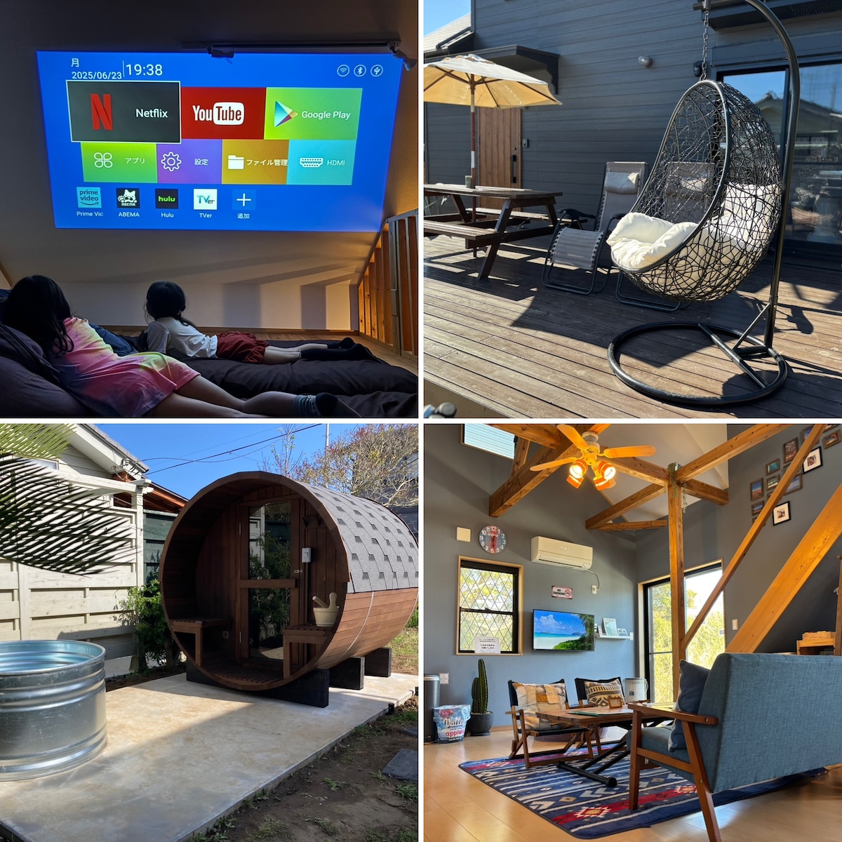 🌊東浪見海岸すぐ。大人も子どももくつろげる——1日1組限定の貸切別荘✨ 波の音に包まれる、プライベートな滞在を。 バレルサウナ(通常ロウリュ使用で100〜110℃)やBBQ(※BBQとサウナはオプション)と広々としたウッドデッキが魅力の、完全貸切の別荘です。 釣ヶ崎海岸や東浪見海岸など、ハイレベルな波を楽しめるサーフスポットにもアクセス抜群。 洗練されたカフェやレストランが点在し、美食と自然が調和するエリアです。 日が暮れたら、星降る空を眺めながらサウナで“ととのう”。 プロジェクターで映画を楽しんだり、仲間とワインを傾けながら語らう時間もまた格別。 静けさの中で、自分たちだけの豊かな時間をお過ごしください。 お子様連れ・ペット連れのお客様もご滞在いただけます。 ※お車でのアクセスが便利です。 ※ 自然に囲まれた立地のため、季節や天候によっては虫が出ることもございます。 苦手な方は、あらかじめその点をご承知のうえでご予約ください。