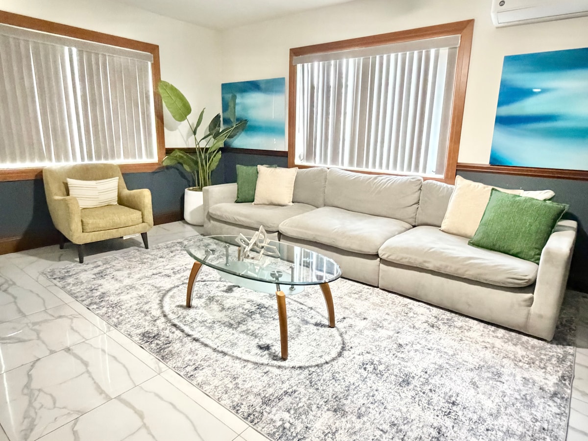Come and create unforgettable memories in this modernly designed single-family home with a spacious layout and a range of comfortable bedrooms. It features two king-size beds, one queen-size bed, and a twin fold-up bed, as well as an Italian queen-size sofa bed. The house is bathed in natural light and boasts modern amenities that cater to your convenience. Located in a prime location, this house is close to all the tourist areas!! The pool is salt water with heater, Also a grill area