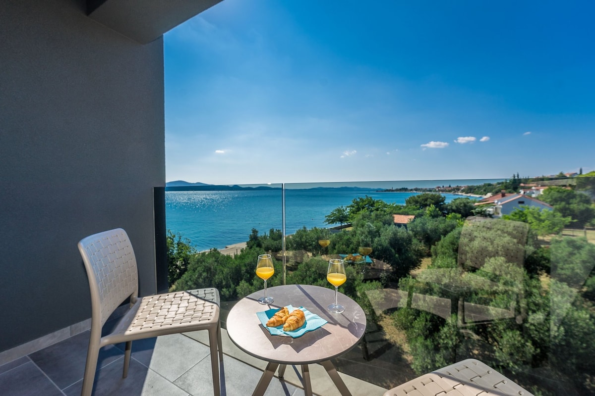 FRADAMA Blue A5 es el alojamiento perfecto si buscas un gran apartamento moderno frente al mar. El moderno apartamento amueblado se encuentra en la pequeña y tranquila ciudad de Sv. Petar na moru, cerca de Zadar. No solo te espera una impresionante vista al mar, sino que también puedes ver la isla opuesta de Pašman y también la famosa isla en forma de corazón de Galešnjak.