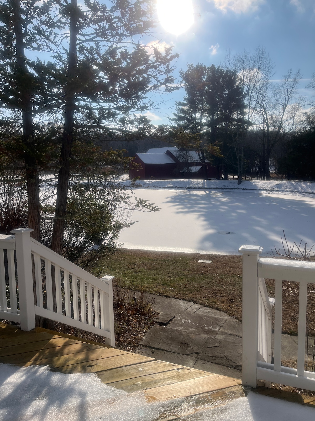 Skylands is a beautiful 20 acre property in the town of Warwick a couple of hundred yards away from an orchard great for apple picking weekends in the Fall. Lovely patios overlooking acre pond nice for relaxing with a glass of wine. Private Guest Suite comprised of sitting room with a fireplace Attached Bedroom has one double bed sleeps 2 people with ensuite bathroom. . Outside you have a front porch overlooking the pond exclusively for your use WARWICK PERMIT 33699