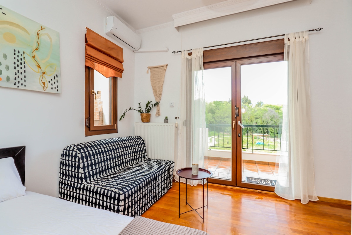 Suite with large balcony and beautiful views, private entrance, free parking and free WiFi internet. It is located in the city of Serres (Odos Exochon) opposite the hotel Elpida Resort & Spa. The location, green everywhere and very close to a forest ideal for hiking. Also 1 'walk from local cafes, restaurants and bar (in summer) tennis courts, swimming pools. In winter all this is only 5 'by car, in the city center where the nightlife is transferred there.