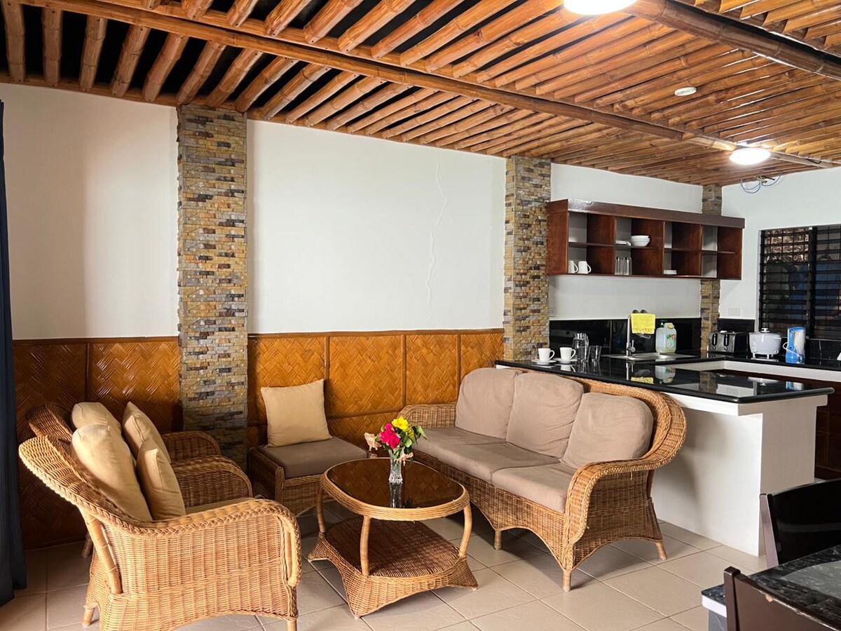 Esta moderna villa independiente está a 95 metros cuadrados y tiene un dormitorio principal con cama tamaño king y baño privado, además del segundo dormitorio con camas individuales, ideal para 4 personas, pero con capacidad para 6 personas con el uso del sofá cama. Se encuentra al otro lado de la carretera de Sunset at Aninuan Beach Resort, los huéspedes pueden hacer un uso completo de las instalaciones del centro vacacional, incluida la limpieza diaria. El centro vacacional está situado directamente en la hermosa playa de Aninuan, con gran esnórquel y buceo y muchos otros deportes acuáticos disponibles.