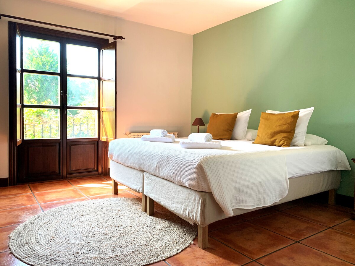 Habitación privada en Casa 'Ohana con cama doble o dos camas individuales y baño individual con baño privado. Jardín compartido, terraza y comedor. Situada en las verdes colinas de Cantabria cerca de Comillas, Playa Oyambre y San Vicente de la Barquera.