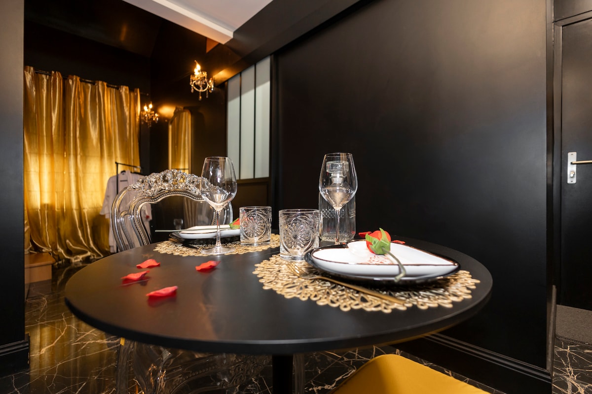Sumérjase en el fascinante universo de la suite Dark Mirror, un lugar diseñado para despertar los sentidos, estimular la complicidad y vivir un paréntesis fuera de lo común. Disfrute de una noche para dos con bañera de hidromasaje/jacuzzi, cama Queen Size, espejo en el techo y accesorios emocionantes que sorprenderán a su pareja y le traerán nuevas emociones y sensaciones fuertes. Una suite donde la sombra acaricia la luz, donde cada detalle susurra una promesa. Atrévase a cruzar el umbral...