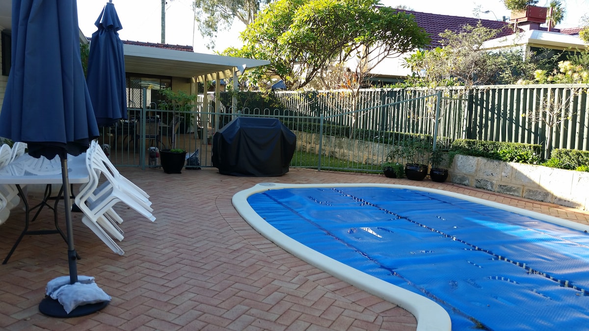 El espacioso y espacioso apartamento de la abuela es perfecto para parejas jóvenes, aventureros y creativos. Más privado y espacioso que una habitación en una casa. Más personal y peculiar que un departamento con servicios. Las obras de arte de WA en las paredes, las flores silvestres de WA en el jardín y los artículos para el hogar de diseño australiano hacen de estas unas excelentes vacaciones australianas en nuestro vibrante y creativo hogar. Cerca de cafés Angove St, rutas de autobús y el CBD. Acceso a la piscina y al jardín. Sin acceso en silla de ruedas LEE TODOS LOS SIGUIENTES DATOS ANTES DE RESERVAR