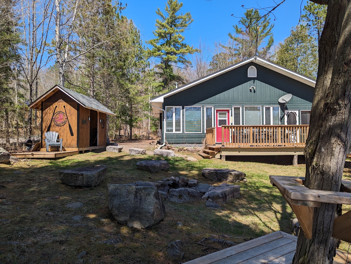 Private getaway in Chalk River on quiet Corry Lake. No neighbours in sight. Canoe, paddle board, swim, hike in the beautiful forest right next door, sit on the covered porch with lake view, roast marshmallows around the fire pit, or cook your favorite meals in our fully equipped kitchen :) Can work from home with WIFI and cell reception! Fully equipped for all year round. 8 people can fit comfortably (but rooms small).Semi-secluded location. 20 mins to nearest town. Check out online guidebook.