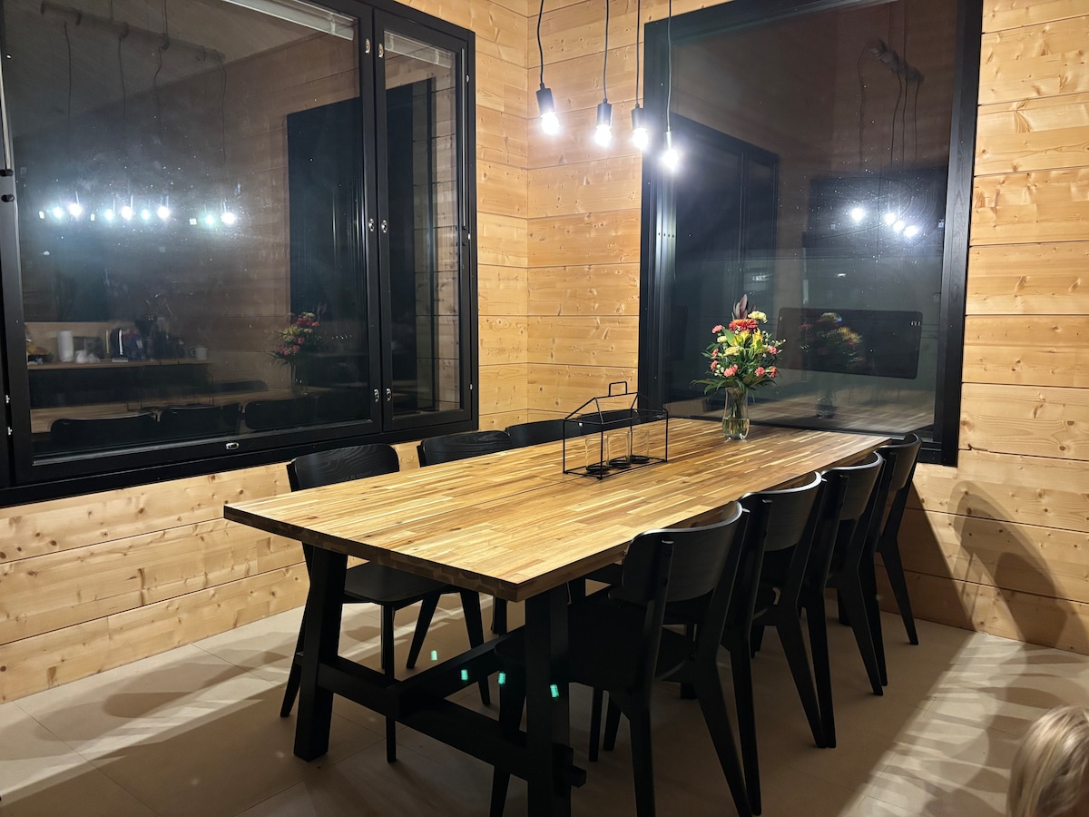 Escápate a una cabaña de madera junto al lago a solo 10 km de la ciudad. Disfruta de la paz y la naturaleza con comodidades modernas: sauna, cocina, chimenea, playa privada, muelle y bote de remos. Se admiten mascotas. Carga de vehículos eléctricos disponible por un cargo adicional. Explora centros de esquí, senderos y pistas, o relájate con la leña incluida. El wifi móvil gratuito te mantiene conectado. Limpieza final/ropa de cama no incluida, pero disponible por un cargo adicional. Las casas de campo cercanas rara vez se utilizan, lo que garantiza una estancia tranquila.