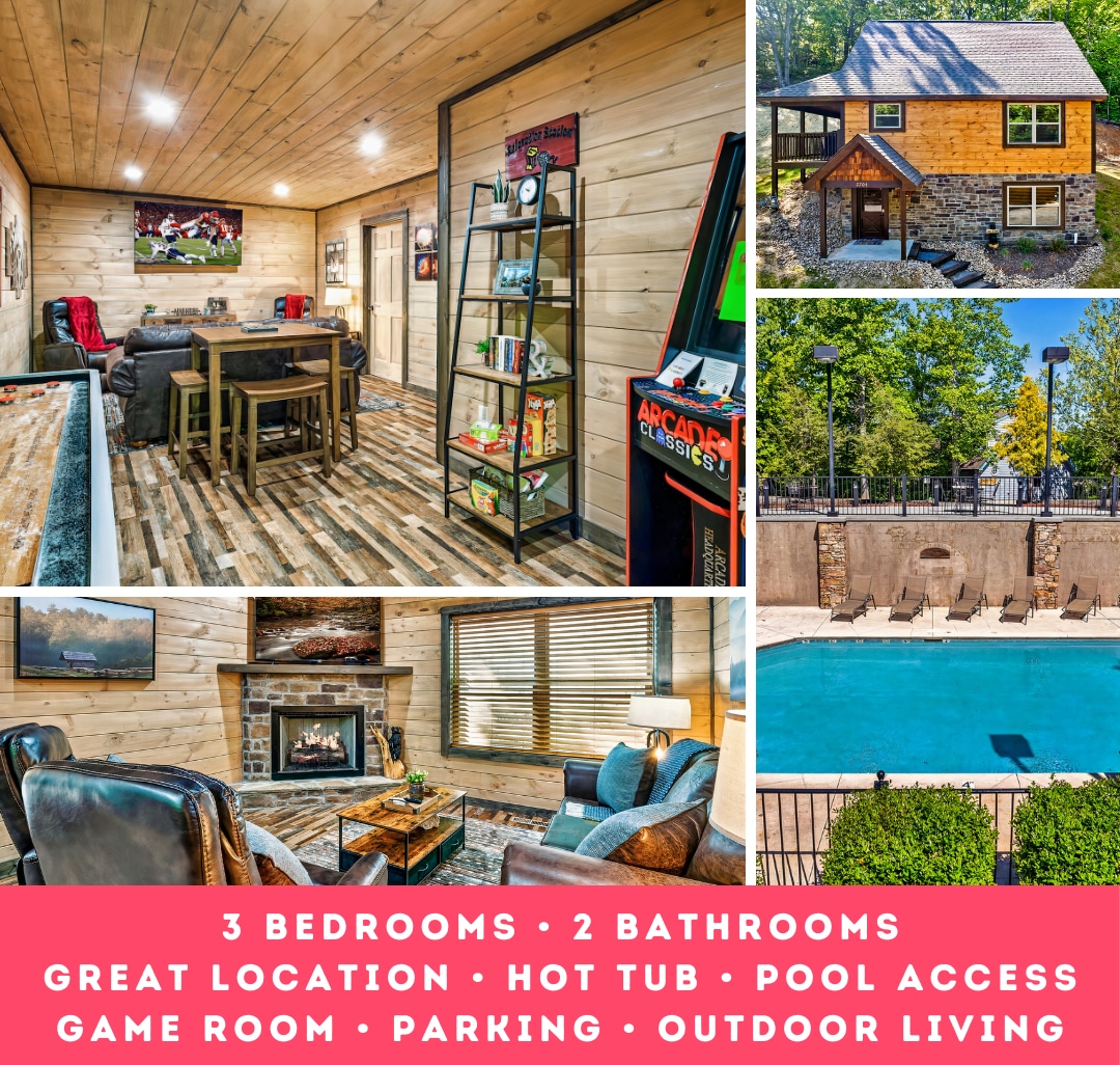- A 1 milla de Parkway, a 2 millas de The Island, a 3 millas de Dollywood, a 7 millas de Gatlinburg. - Wifi de alta velocidad. - Bañera de hidromasaje. - 2 piscinas del centro vacacional. - Cama tamaño king. - Sofá cama tamaño queen - Televisor inteligente de 55 pulgadas en el salón, televisor inteligente de 43 pulgadas en el dormitorio. - Barbacoa de gas natural. - Set de cortesía de café, champú, acondicionador y gel de ducha. - Estacionamiento para 1 vehículo. Nota: La plaza de aparcamiento está en una ligera pendiente delante de la cabaña. Aparcamiento adicional disponible en el aparcamiento principal del centro vacacional.