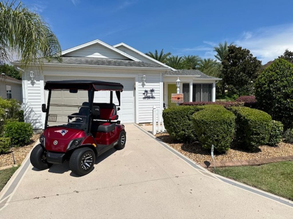 Come and enjoy this relaxing piece of paradise surrounded by lush greenery with your own, small, private pool (not heated). "Serene on the Green" is a beautifully remodeled 3 bedroom, 2 bathroom designer home (1,536 sqft) with a large screened outdoor pool area with lots of privacy. Our location 320 steps from the Santiago Recreation Complex with two golf courses and a short ride to Lake Sumter Landing and Spanish Springs is perfect. A new custom 2021 Yamaha QuieTech golf cart is included!