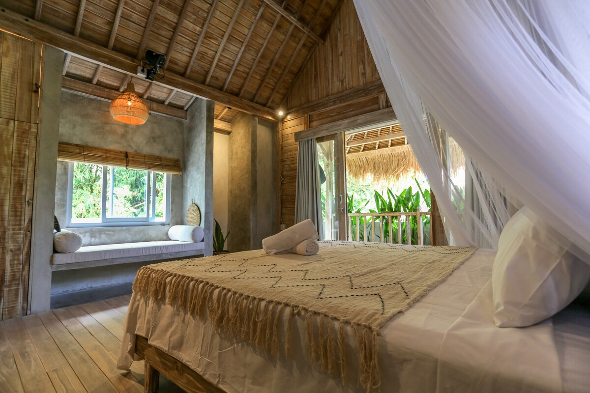 Tu casa de campo balinesa se encuentra arriba con vistas a la piscina y a la zona del jardín. Incluye una cómoda cama king, baño, aire acondicionado, ventilador, dispensador de agua potable, mininevera y tu propio balcón con vistas a la piscina, ADEMÁS de un espacio separado en el cenador con vistas a los árboles de bambú. También tienes acceso a tu propio salón junto a la piscina. Este anuncio es solo para la casa de campo de arriba (abajo se alquila por separado).
