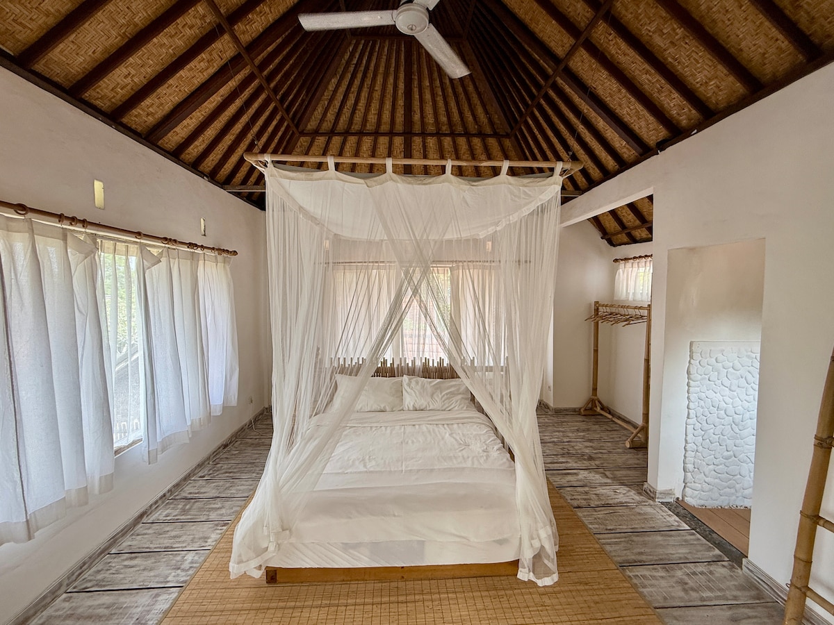 Lujosa villa privada con piscina de 6x3 metros. Segura, privada, protegida. Exuberante jardín y cocina protegida pero al aire libre para comer y relajarse junto a la piscina. Cama tamaño queen, bañera y ducha exteriores, con vistas al estanque de peces, cocina totalmente equipada. Aire acondicionado, televisión, excelente wifi, limpieza diaria y desayuno incluido. Estamos a 8 minutos a pie de la carretera principal o a un corto trayecto en scooter. Esto significa paz y tranquilidad, y sin ruido de coches. Nuestro personal estará encantado de llevarte en scooter si es necesario.
