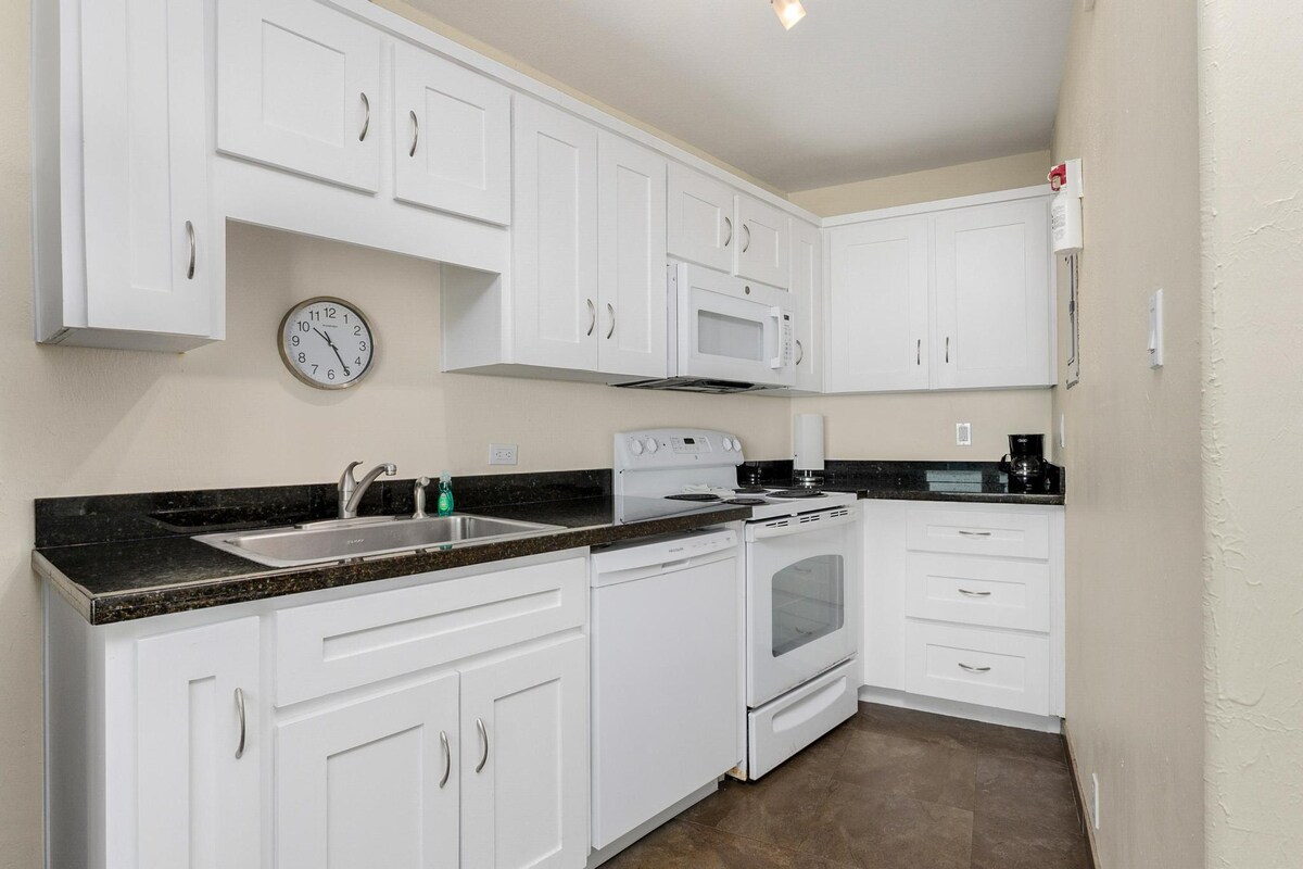 El Lively Beach Studio Efficiency es la escapada perfecta para dos... Moderno y cómodo con toques de diseño en todas partes, incluida una cocina eficiente con pequeño refrigerador, microondas y encimeras de granito. Todas las unidades tienen una cama tamaño king y un área de trabajo de escritorio para el lugar perfecto para relajarse con un buen libro, ponerse al día con el trabajo, ver la gran televisión de alta definición o simplemente ponerse al día. **Sin gastos de limpieza estándar ** Totalmente amueblada: de 310 a 349 pies cuadrados