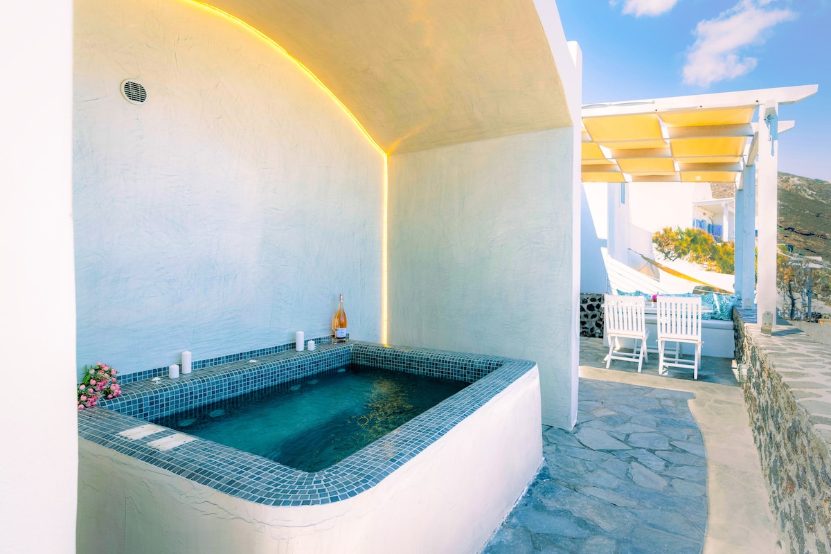 Discretamente escondido entre el pintoresco pueblo de Oia y el corazón de la capital, Fira, Sylvia's Villa ofrece un ambiente conmovedor y vistas ininterrumpidas al mar Egeo. Situada a 600 metros de la playa, da la bienvenida a sus huéspedes para que experimenten el verdadero estilo de vida isleño. Vista única del amanecer desde la acogedora terraza. Disfruta de momentos relajantes en el jacuzzi privado. Cesta de bienvenida con frutas y vino. ¡Celebra tu ocasión especial con nosotros y disfruta de un pastel de cortesía!