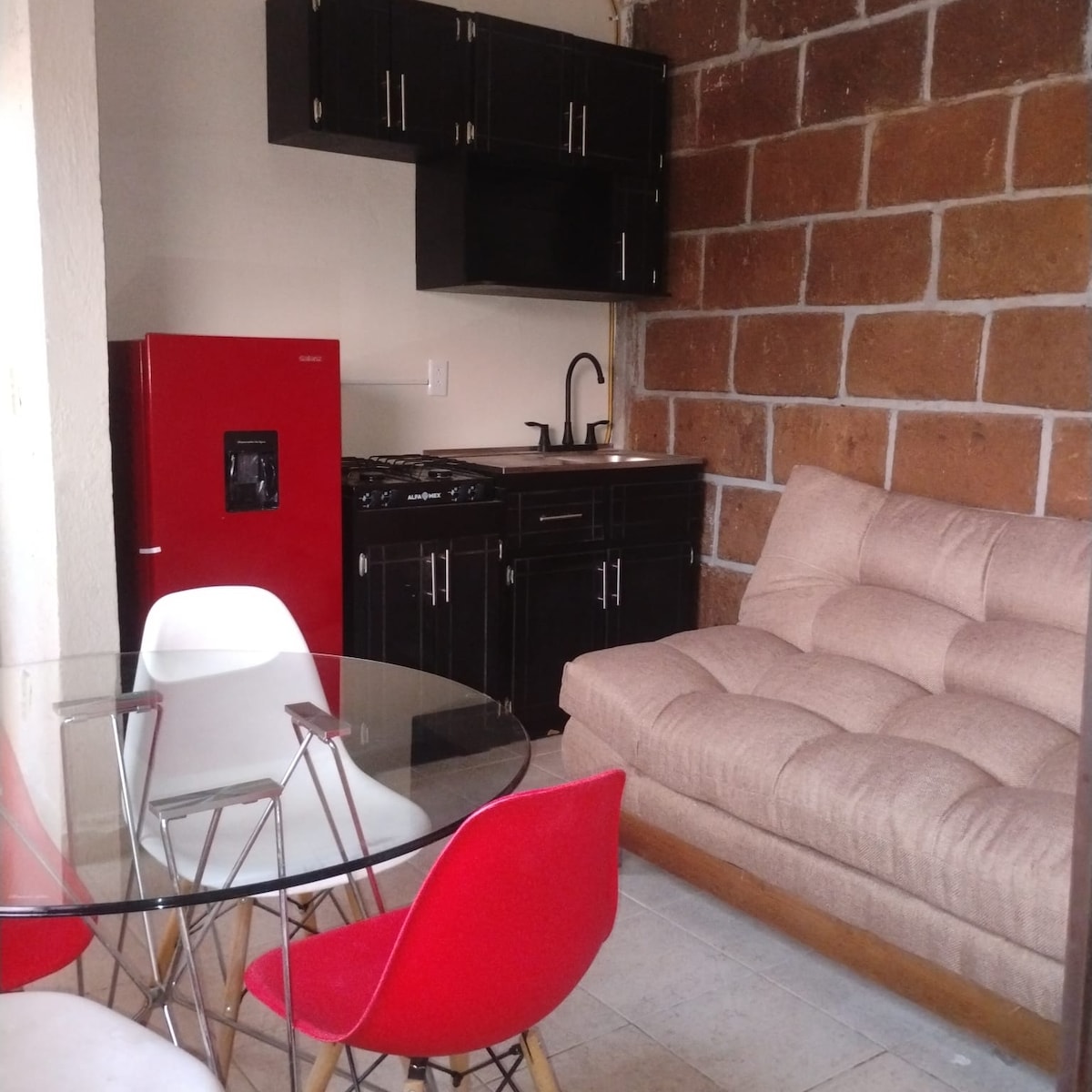 Hermoso loft con diseño moderno, minimalista, pensado para ofrecerte una estancia tranquila y cómoda. Contamos con estacionamiento particular y todos los servicios necesarios para sentirte como en casa. Tendrás todo lo que necesitas a solo unos pasos: -Farmacia Similares -Mini Súper Chedraui justo enfrente -Gimnasio cercano -Tiendas de abarrotes, Oxxo y más.. Además, la zona cuenta con numerosos salones de eventos, por lo que es perfecta si vienes a una celebración o visita familiar.