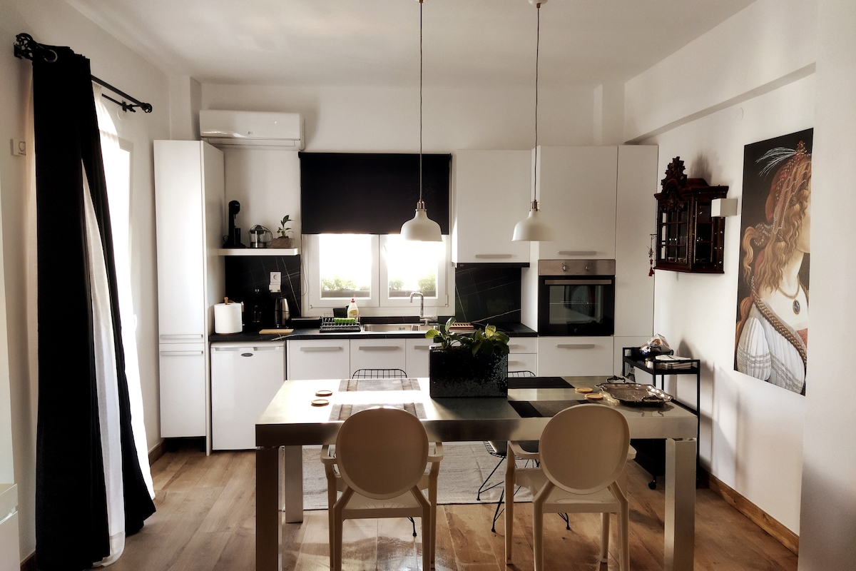 Un apartamento minimalista de estilo rústico en la planta baja con un acogedor patio trasero. Decorado con muebles de madera de reciclaje personalizados. El departamento está en un vecindario tranquilo. Los huéspedes pueden estacionar justo afuera de la casa. El moderno pueblo de Corinto se encuentra aproximadamente a 5 km al noreste de las antiguas ruinas. El centro de Corinto y la playa (Kalamia) que tienen cafeterías, bares y restaurantes están a 5 minutos a pie del apartamento. Se admiten todas las personas.
