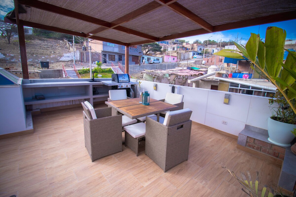 Este moderno alojamiento es ideal para parejas y familia, está ubicada cerca al mar y centros de diversión en una zona segura, este departamento se encuentra en la terraza del edificio con vista al mar, el cual cuenta con 2 habitaciones, una con cama king y otra con un camarote de 1 plaza y media. 5pax Además cuenta con un baño con tina y baño de visita. Y una amplia sala comedor con equipos modernos, muebles acogedores y mamparas grandes de vidrio con vista al circuito de playa de Barranca.