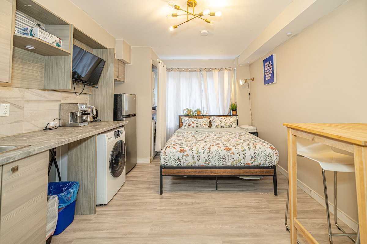Estudio con cama doble, cocina pequeña, baño privado y entrada privada al apartamento. Muy buen vecindario, a 10 minutos a pie de la estación de metro Jolicoeur, que está a 8 estaciones del centro de la ciudad (15 minutos). Muy amable y hospitalario. Medio sótano. La escalera no es muy grande (un poco más pequeña que las escaleras normales). El techo es más bajo de lo normal, 6 pies y 7 pulgadas (2 metros). ¡No apto para más de 2 personas! Perfecto para estadías cortas.