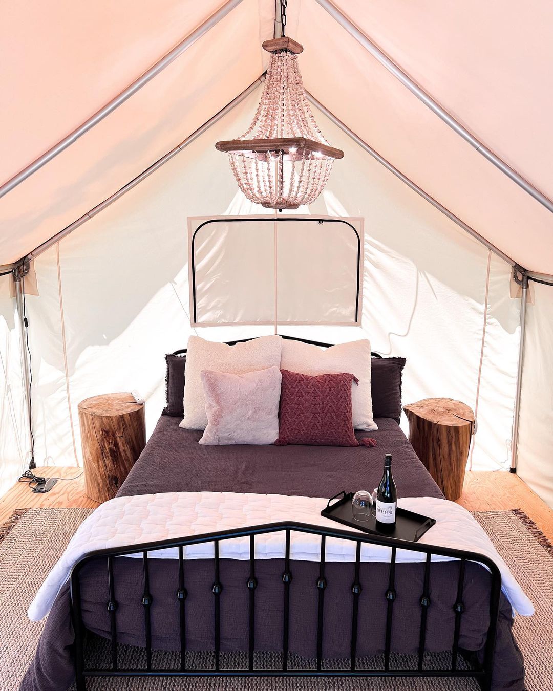 Tienda de campaña #3. Somos principalmente un lugar de música en vivo que ofrece alojamientos únicos, rústicos pero cómodos en el corazón del Paradise Valley. Visita el sitio web de Pine Creek Lodge para conocer nuestro horario de conciertos. Se incluyen 2 entradas con tu estancia. Nuestras tiendas de estilo glamping están en nuestra propiedad, justo fuera de la cerca del lugar del concierto. Están terminadas con interiores acogedores y comodidades estándar. No hay fontanería en tu tienda, pero las suites de baño compartidas pero privadas se encuentran a unos 75 pies de distancia.