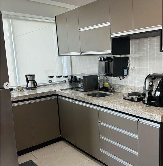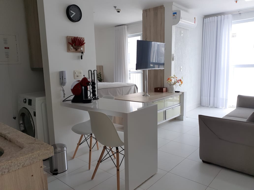 Apto 45 m2. Quarto:Cama Queen,armários,bancada escritório,TV 4K 50”,ar-cond.,roupa de cama/banho. Sala: sofá cama,TV 4K 50”,ar-cond.,mesa e 4 cadeiras design italiano. Cozinha:armários,bancada,cooktop 4 bocas,geladeira,forno elétrico,forno microonda,cafeteira elétrica,filtro água,sanduicheira, panelas,utensílios. Piscina borda infinita, hidro,sauna,academia,brinquedoteca,salão festa,espaços gourmet. 1 vaga garagem. Portaria 24 horas porteiro e segurança. Temos outro apto