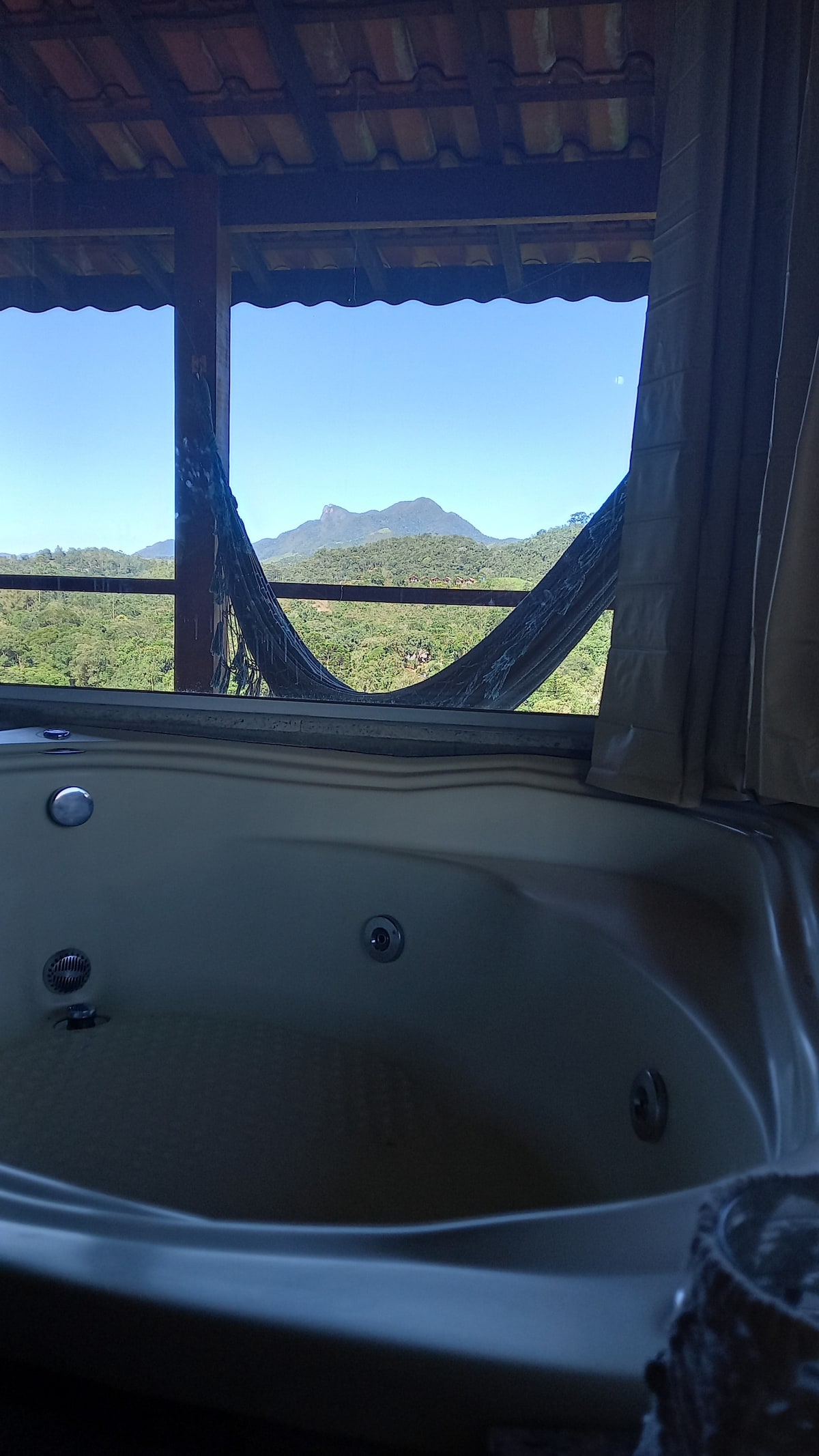 Relájese en este lugar único y tranquilo. Conexión con la naturaleza sin perder comodidad. Chalet con bañera de hidromasaje, cocina, chimenea y mucha calidez. Zona exterior con ducha y tumbonas. Piscina y mirador en la propiedad con vista a Serra da Mantiqueira.