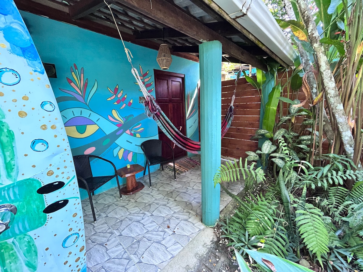 Escápate a nuestro exuberante refugio tropical con tres cabañas privadas, cada una con su propio patio, aire acondicionado, ventiladores de techo, camas cómodas y una cocina pequeña con las comodidades necesarias. Rodeados de vibrantes jardines para una verdadera privacidad, los huéspedes pueden relajarse en la gran piscina o reunirse en el rancho completamente surtido para cocinar y conectarse. A solo unos pasos de la playa, es una estadía tranquila y rica en naturaleza con las comodidades de un hogar y el encanto de un refugio aislado.